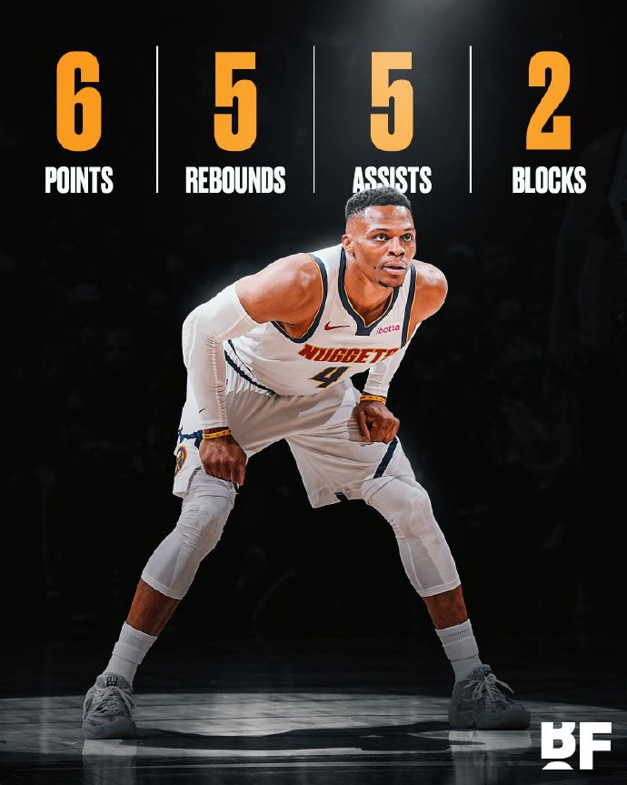 威少效力6队的首秀全部输球,如今效力掘金首秀10中2仅得到6+5+5数据,创造他6次首秀单场最低分与最低投篮命中率纪录。要知道,威少此役全场10投2中,投篮命中率20%;三分6中1,三分命中率16.7%;罚球4中1,罚球命中率25%,仅得到6分5篮板5助攻1抢断2盖帽。