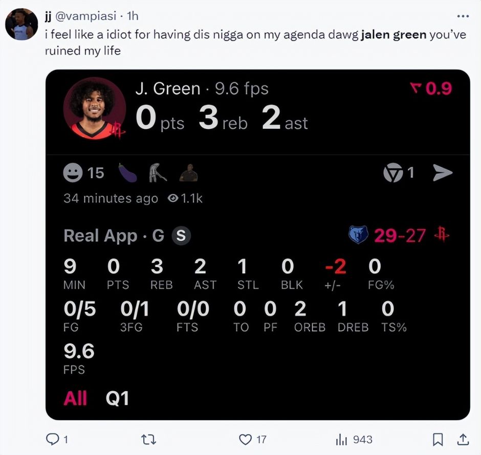 首节杰伦-格林的表现也是灾难性的,单节9分钟里5中0,三分1中0,突破篮下被连续大帽,首节0分3篮板2助攻1抢断,正负值-2。有美国球迷已经开喷了。