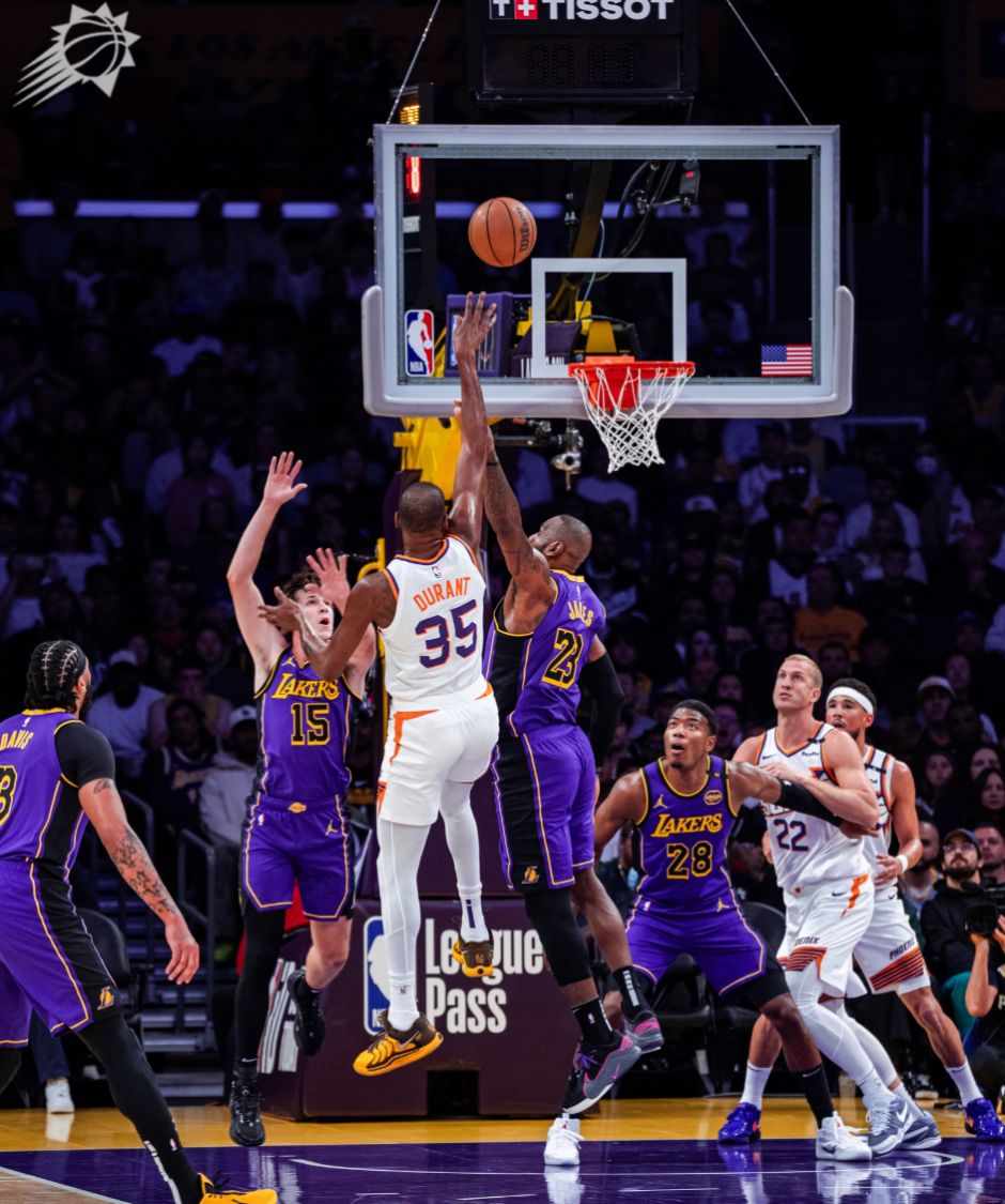 末节KD连续造犯规罚球,湖人拉开到10分还是KD关键2+1续命,一次上篮不中分差再度拉开到9分,布克对AD犯规分差拉开到10分以上,KD无力回天啊。KD突破暴扣还在努力,比尔追了一个三分,但还是没用了。