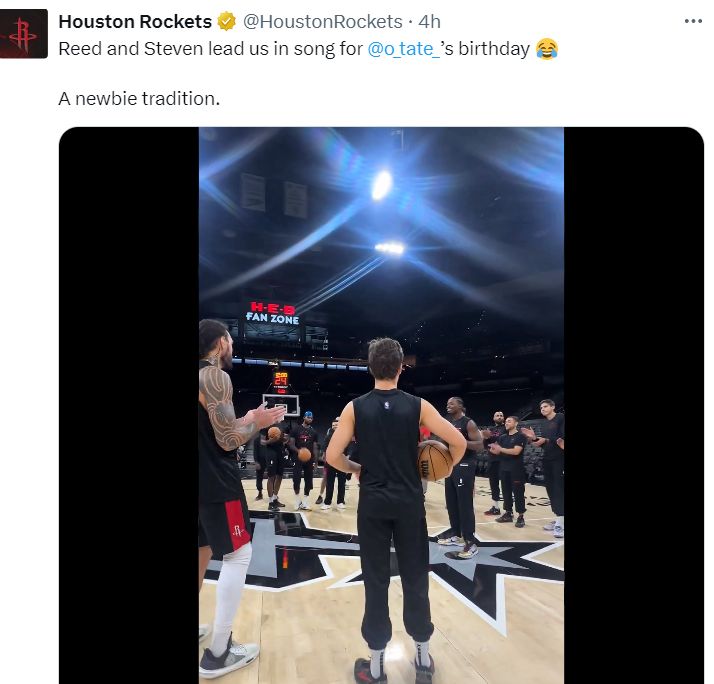 赛前火箭全队为泰特唱生日快乐歌,今天是泰特29岁的生日。