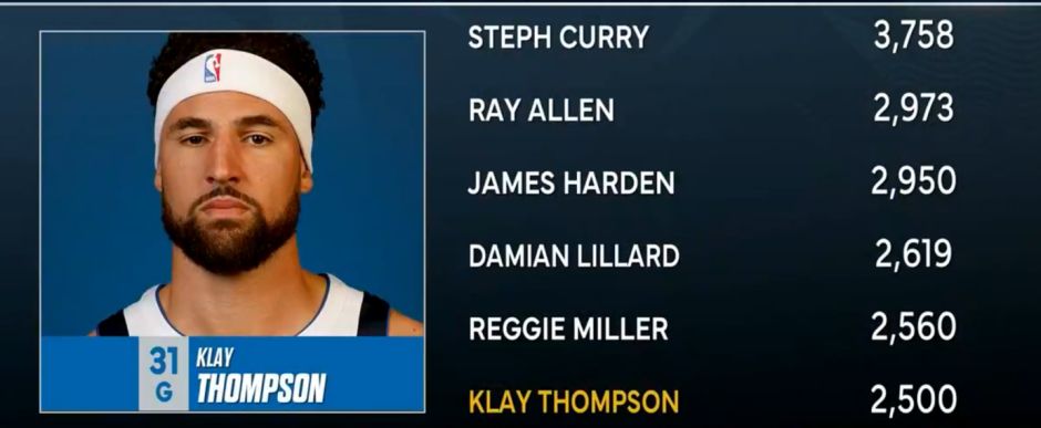 末节克莱命中第二个三分球,他生涯命中2500个三分排在历史第六位。