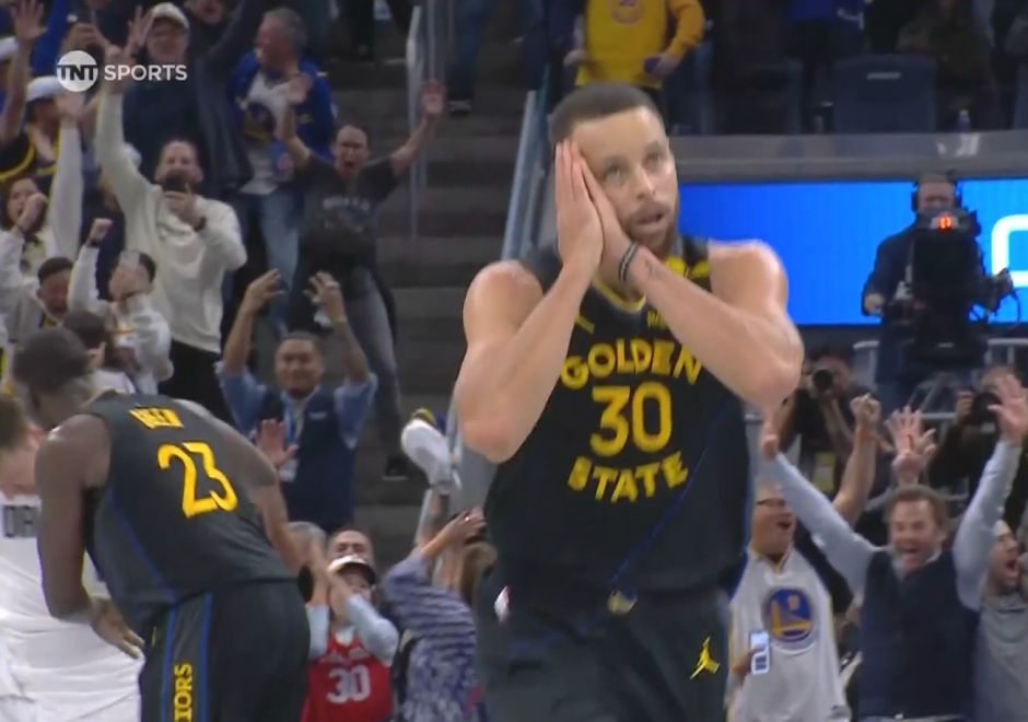 库里最后时刻连得12分,命中关键三分,做晚安安庆祝动作。
