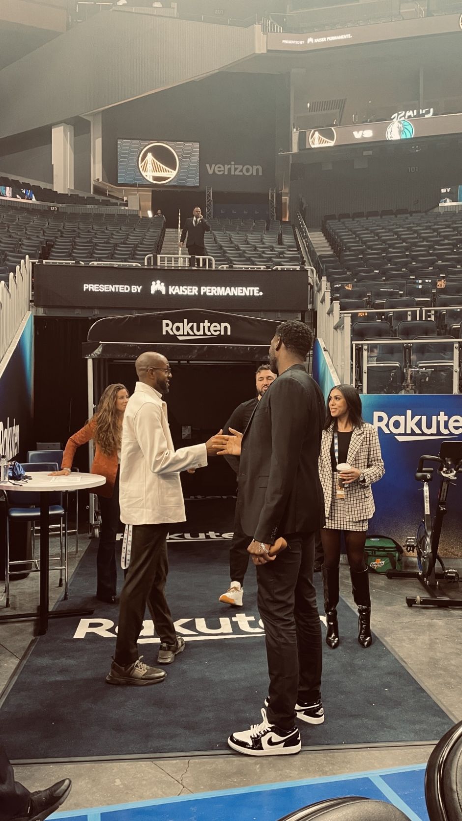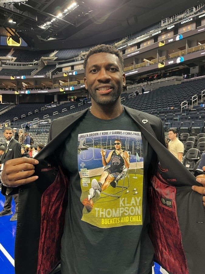 前勇士球员埃泽利来到现场,他穿一件印有勇士时期克莱的T恤,为老东家和昔日队友加油。