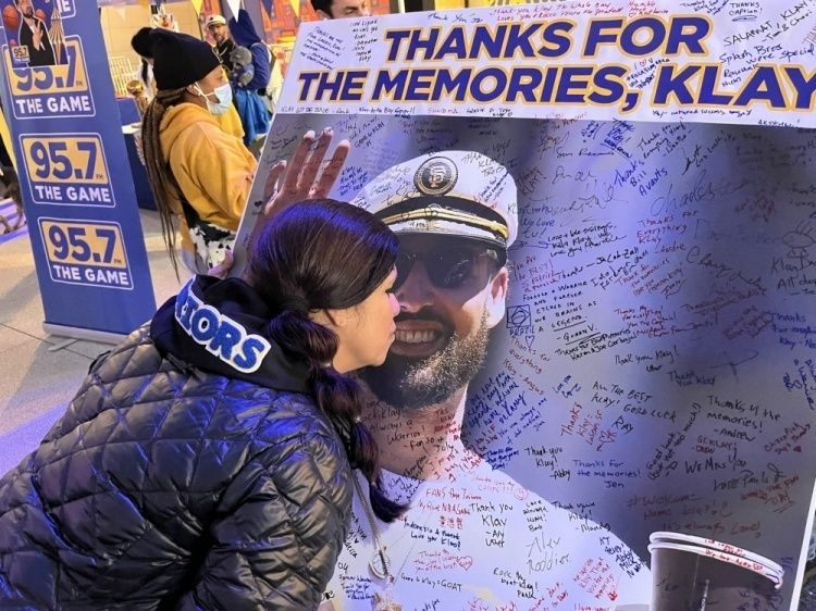 大通中心球迷声援克莱的签名墙,上面密密麻麻都是签名,还有女球迷上去亲吻克莱画像。