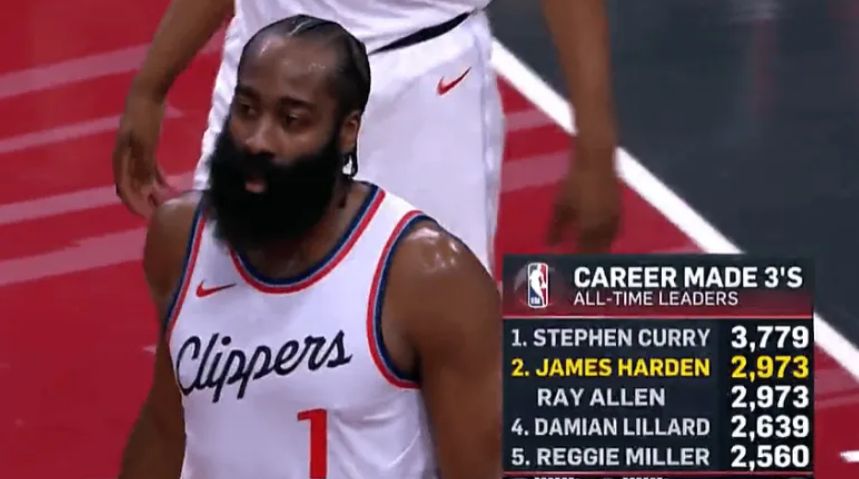 哈登三分球的命中数已经2970记,距离排名NBA历史三分榜第二位的雷-阿伦还差3个三分。只要哈登此役命中4个三分,就将超越雷阿伦升至历史第二。