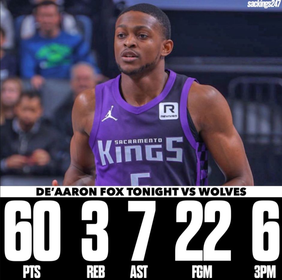 全场比赛福克斯44分钟,34中22,三分10中6,罚球11中10,拿到60分7助攻3篮板3抢断1盖帽,命中率62.9%,三分命中率60%,真实命中率77.2%。