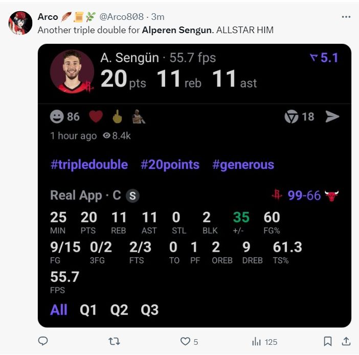 北京时间11月18日,火箭轻取公牛豪取五连胜,火箭继续稳住西部第三的席位。这场比赛阿尔佩伦-申京面对尼古拉-武切维奇打得游刃有余,轻松拿下20+三双的数据狂刷纪录。