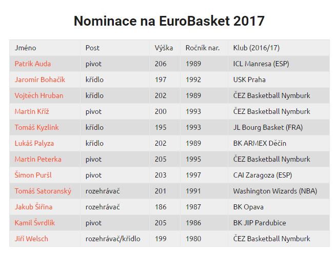 此外入选本次12人大名单的球员还有:Patrik Auda、Jarmoir Bohacik、Vojtech Hruban、Martin Kriz、Tomas Kyzlink、Lukas Peterka、Simon Pursl、Jakub Sirina、Kamil Svrdlik、Jiri Welsch。前NBA球员扬-韦塞利因疲劳选中休战本次欧锦赛。