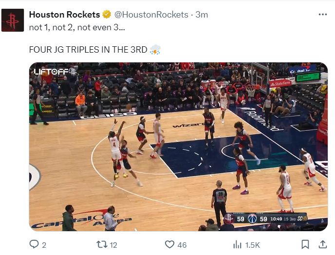 火箭官方也盛赞格林的表现:一个三分、两个三分、三个三分,格林在第三节12分钟里,13中8+三分10中6拿到22分3篮板1抢断。三节打完杰伦-格林已经拿到29分+7个三分球。