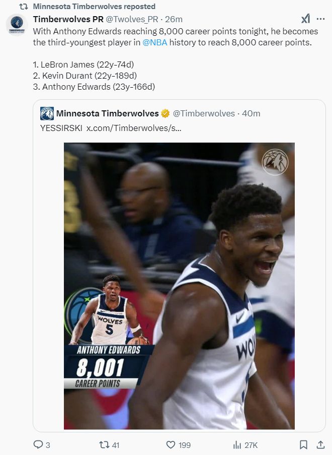 此役是森林狼背靠背的第二场,爱德华兹在纽约拿到31分带队取胜,此役又来到克利夫兰挑战联盟战绩第一的骑士队,他上半场8中3+三分6中3拿到11分3助攻1盖帽,他完成了个人8000分里程碑,他成为NBA历史上第三年轻的8000分先生,仅次于詹姆斯、加内特。