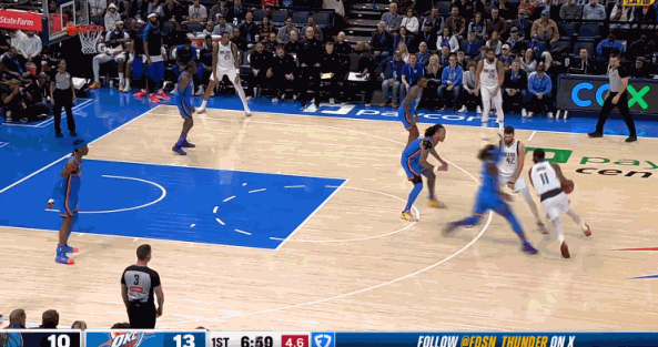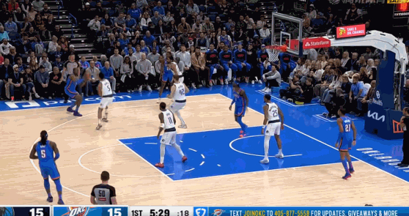 次节,卡鲁索三分再中,加福德扣篮,杰林-威廉姆斯、威金斯先后打成2+1,雷霆领先8分。普洛斯珀三分命中,加福德被华莱士不慎踢到头部,返回更衣室检查。华莱士连得5分,普洛斯珀打成2+1,丁威迪空接上篮,多尔特、亚历山大的三分命中,欧文、华盛顿也连中三分。半场结束,雷霆62-60领先独行侠。