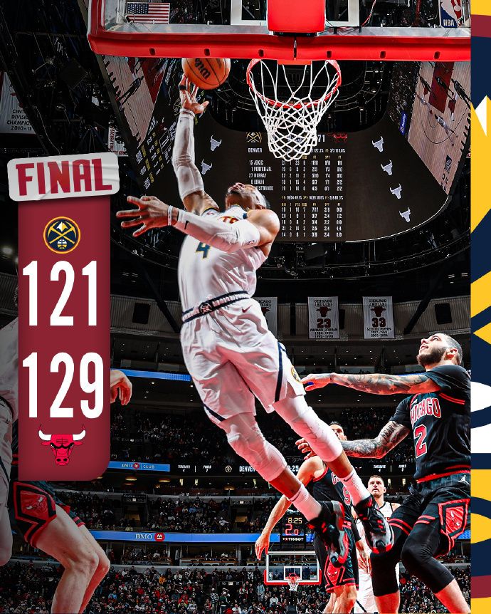 北京时间1月28日,NBA常规赛掘金客场对阵公牛,掘金在最多领先12分情况下,他们下半场被公牛逆转崩盘,最终掘金121-129爆冷负公牛遭遇2连败,公牛结束2连败。约基奇本赛季21次三双联盟第一,生涯第151次三双联盟历史第三。