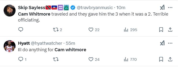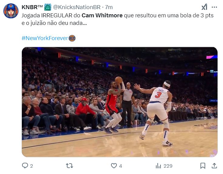 尼克斯球迷:惠特莫尔一个走步球被吹了三分命中,裁判就在旁边没吹。