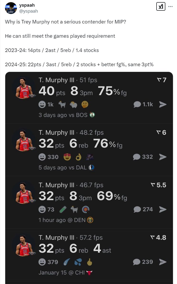 美媒:23-24赛季墨菲场均14分5篮板2助攻1.4盖帽,24-25赛季场均22分5篮板3助攻2盖帽,他已经成为MIP的有力争夺者。过去三场比赛墨菲合计拿到113分+命中21个三分球。