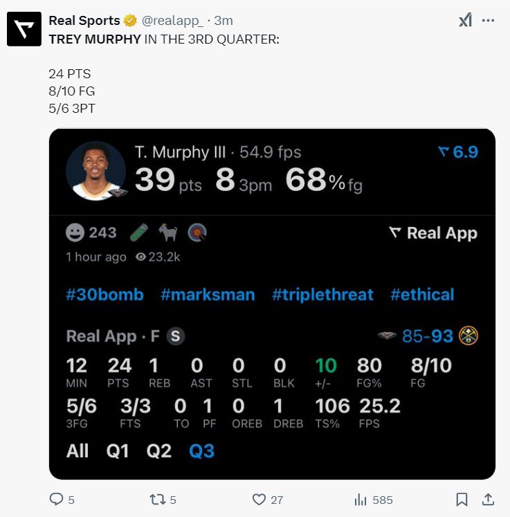 美媒:墨菲对阵掘金三节比赛,真实命中率超过95%拿到39分,之前的前两场比赛,对阵达拉斯真实命中率92%拿32分,对阵绿凯真实命中率94%拿到40分,三场比赛他已经合计21个三分