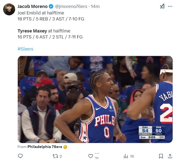 第二节马克西的效率依旧很高3中2拿到5分2篮板1助攻2抢断,半场打完马克西11中7拿到16分6助攻2抢断。恩比德半场10中7已经拿到18分5篮板3助攻。