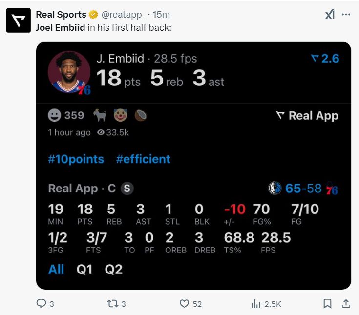 第三节大帝的手感略有下滑,打了6分钟5中2拿到4分3篮板4助攻,三节打完15中9,拿到22分8篮板7助攻1抢断,恩比德朝着约基奇发展了,各种与马克西挡拆送出助攻,大帝也帮助球队完成反超。大帝也是真惨被加福德一肘击中面部,幸好问题不大。