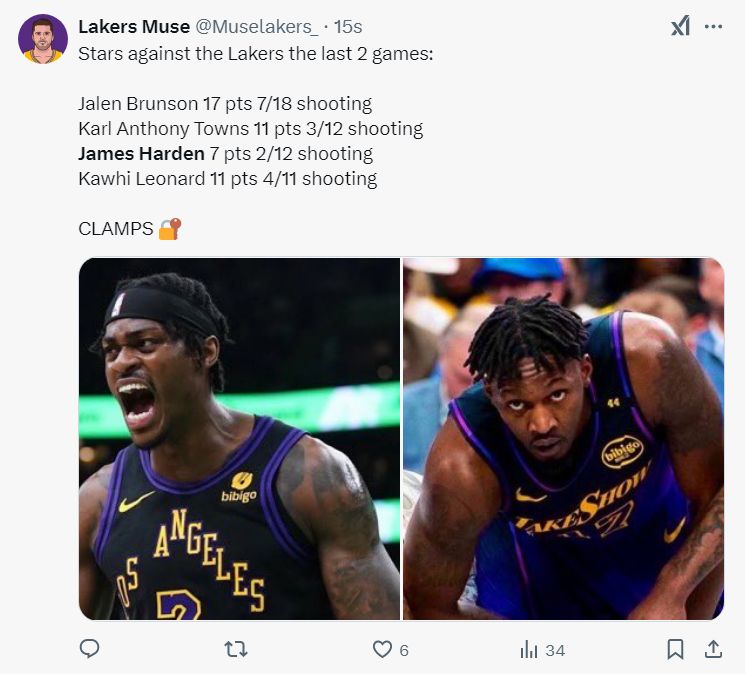 湖媒晒出范德比尔特+芬尼-史密斯最近两场比赛的防守表现,布伦森18中7+唐斯12中3;哈登12中2+伦纳德11中4,没有浓眉的湖人防守也没有下滑。