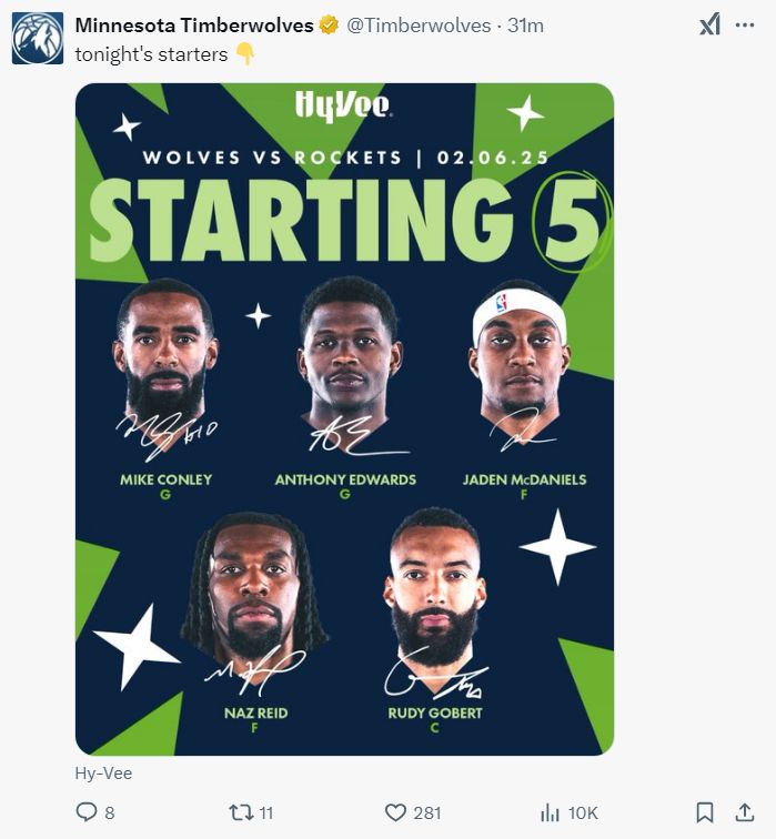 森林狼虽然是背靠背第二场但爱德华兹还是继续打,兰德尔与迪温轮休。