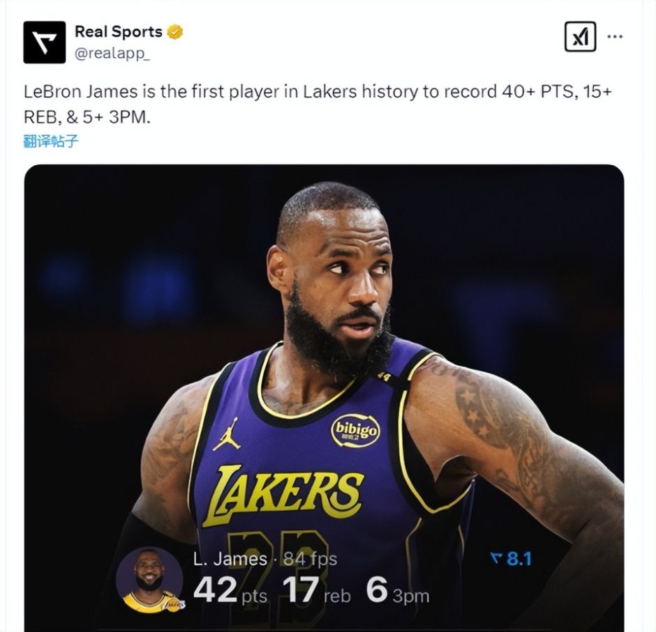 詹姆斯成为湖人队史第一位单场得分40+、篮板15+并且三分球5+的球员。詹姆斯还超越乔丹成为了NBA历史上最年老的砍下40+的球员。此外,詹姆斯42分创造他个人本赛季得分新高,17个篮板也是他个人本赛季篮板球新高。