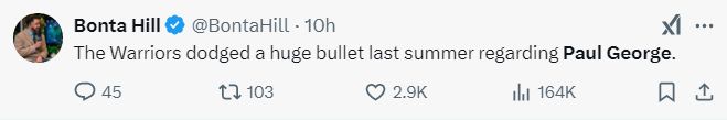 勇士记者Bomta Hill写道:去年夏天,勇士队错过乔治等于是躲过了一颗巨大的子弹。