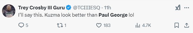 费城记者Guru写道:我就这么说吧,库兹马都比保罗乔治更强。