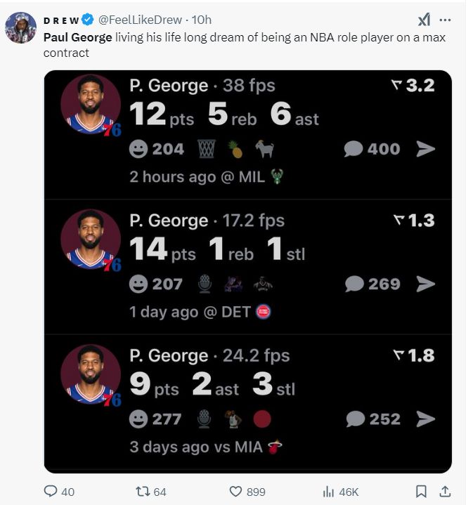 76人随队记者Aidan LaPorta写道:到目前为止,乔治的签约是一个彻底失败的签约。