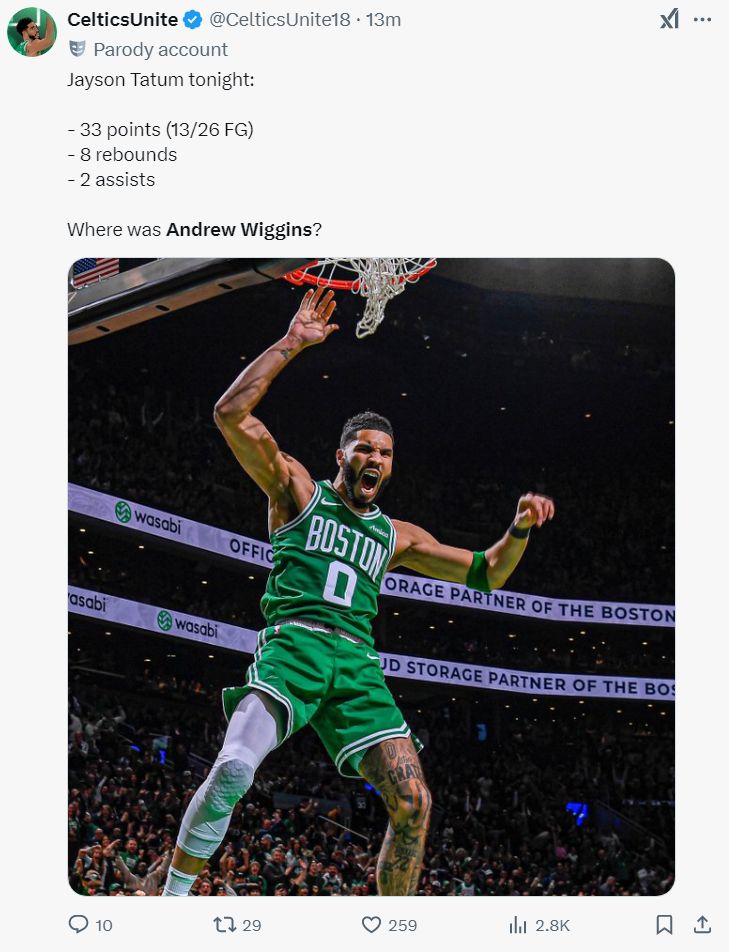 塔图姆全场比赛38分钟,26中13,三分12中4,拿到33分8篮板2助攻1盖帽0失误,命中率50%,塔图姆算是面对面复仇了嘴哥。美媒还发声嘲讽:请问威金斯在哪里?