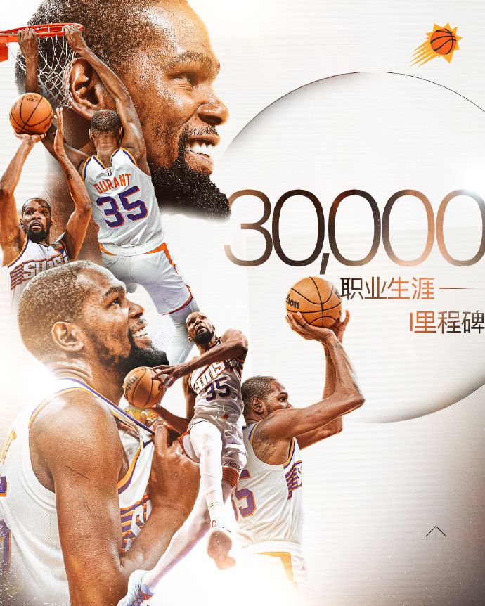 杜兰特第三节借助罚球得分,达成生涯30000分里程碑。
