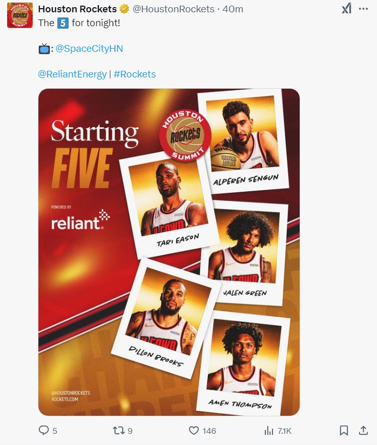 火箭这边范弗利特、史密斯继续伤停,太阳这边布克、阿伦都无法登场。