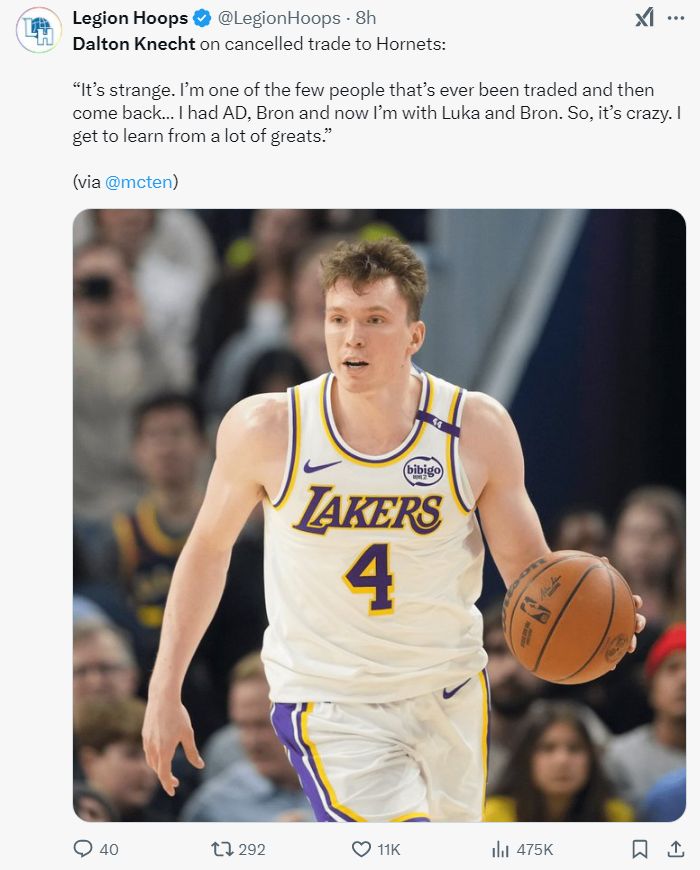 赛前他谈到自己的交易被取消:“很奇怪,我是历史罕见交易达成又取消的几人之一,现在我跟勒布朗、东契奇在一起,我可以从他们那里学习到很多东西。”