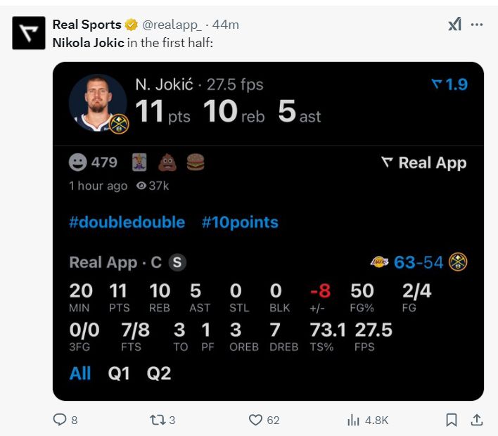 第三节约基奇还是串联全队,打了11分钟没有得分,但送出了5次助攻,这5次助攻后约基奇已经帮助他完成三双,三节打完约基奇12分11篮板10助攻1抢断,真实命中率63.8%。