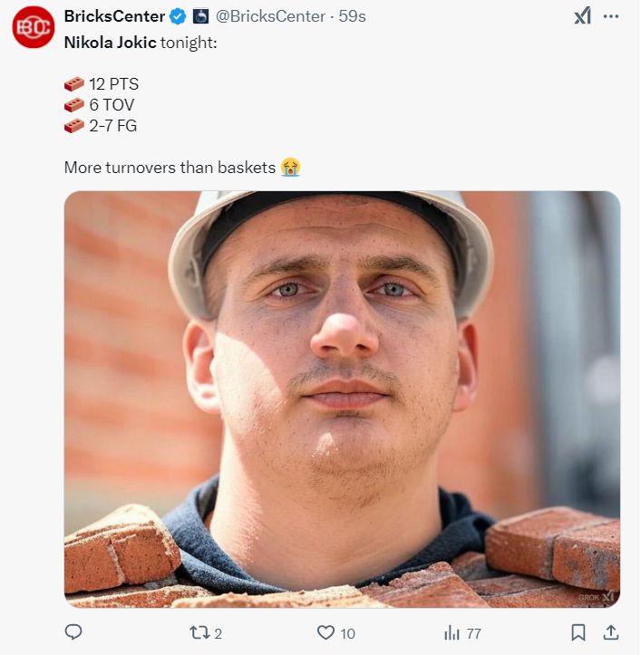 约基奇末节打了3分钟比赛已经被拉开到20+马龙放弃比赛,约基奇全场比赛35分钟,7中2,拿到12分13篮板10助攻1抢断6失误,命中率28.6%。美媒:约基奇失误比运动战还多,图片就是约基奇丢砖头。