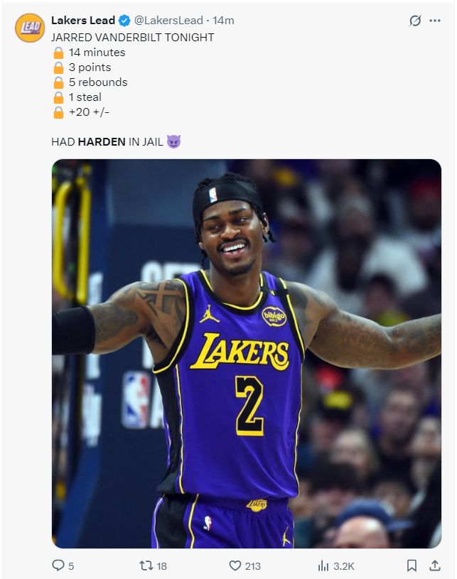 湖人媒体晒出范德彪3分5篮板1抢断,正负值+20的数据写道:将哈登装进监狱。