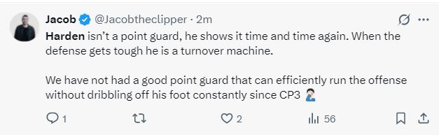 快船记者:哈登不是控球,他又一次证实了这一点,当防守变得强硬时哈登就是一个失误机器,自保罗后我们还没有一个真正能持球的发动有效进攻的控卫。控卫不是一直运球,而是要发动进攻。