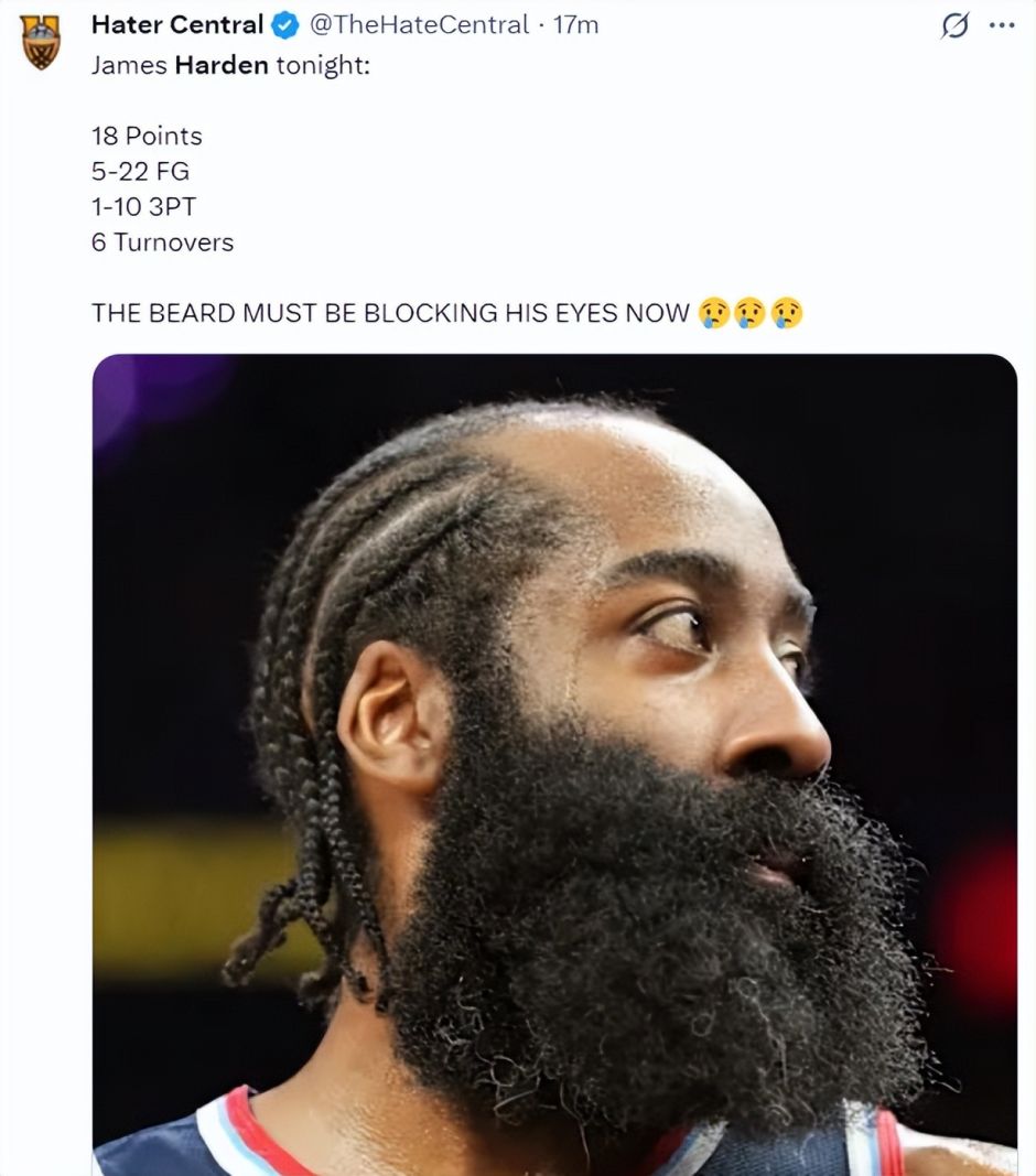 美媒HC写道,哈登22中5+三分10中1拿18分6失误,他的胡子一定遮住了他的眼睛。