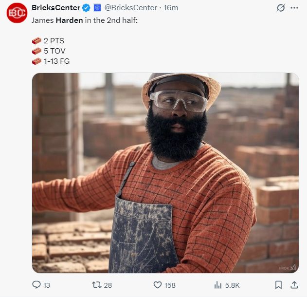 美媒BC晒出哈登下半场13中1+三分6中0的数据,图片是哈登丢砖头。