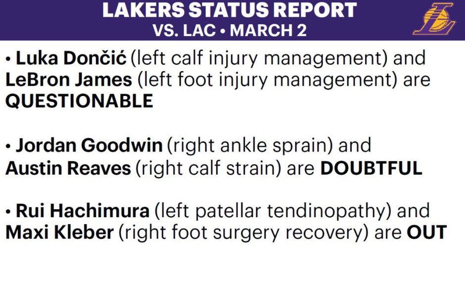北京时间3月2日,湖人官方公布了明日对阵快船的伤情报告,具体如下——