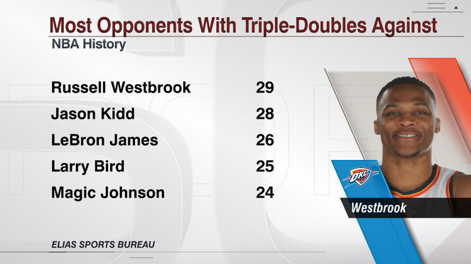 根据ESPN Stats & Info‏数据统计,加上今天对阵公牛拿到的三双数据,威斯布鲁克已经在所有29支球队身上拿到过三双数据,这是NBA历史首位能做到这点的球员。
