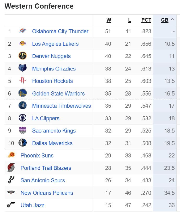 湖人加时击败尼克斯后,他们成为西部第3支达成40胜的球队,此前雷霆与掘金更早达成40胜。不过湖人40胜21负战绩,力压掘金40胜22负战绩,湖人领先半个胜场排在西部第二。