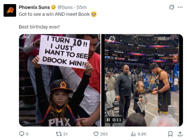 赛后一位首场手持“布克得赢得一场胜利才能作为我生日礼物”展板的小女孩获得了布克的亲笔签名,在独行侠主场布克也有球迷的追随。