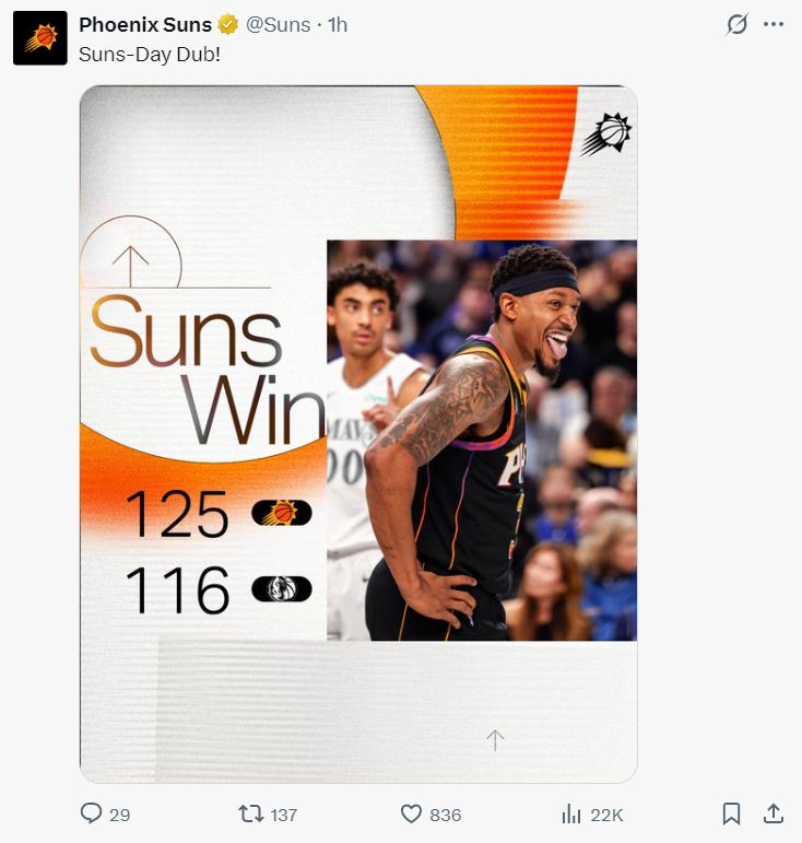 这场比赛后太阳30胜34负与独行侠32胜33负只差1.5个胜场,因为独行侠阵容太过于惨烈,太阳本赛季进入附加赛还存一线曙光。