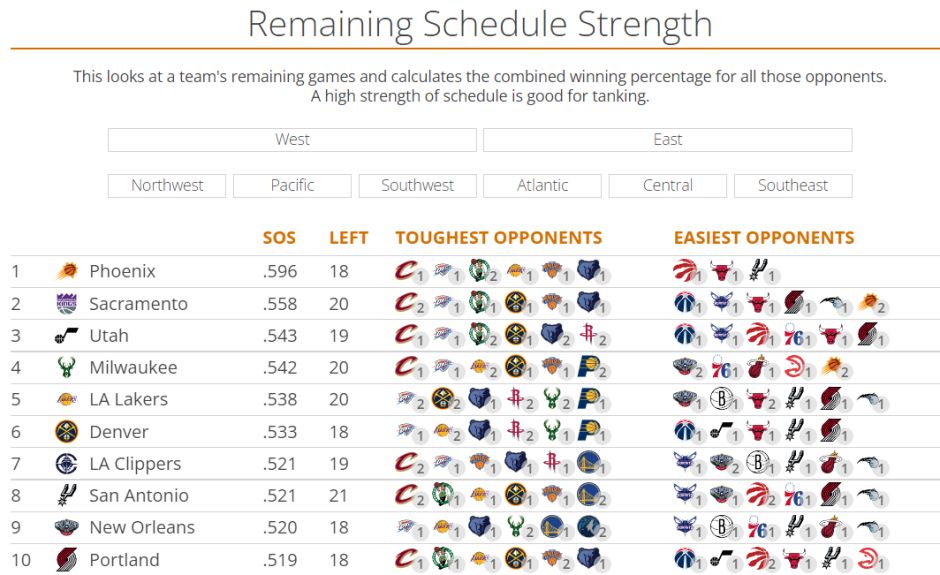 太阳余下18场比赛对手的平均胜率高达59.6%,太阳依旧有着全联盟最艰难的赛程。