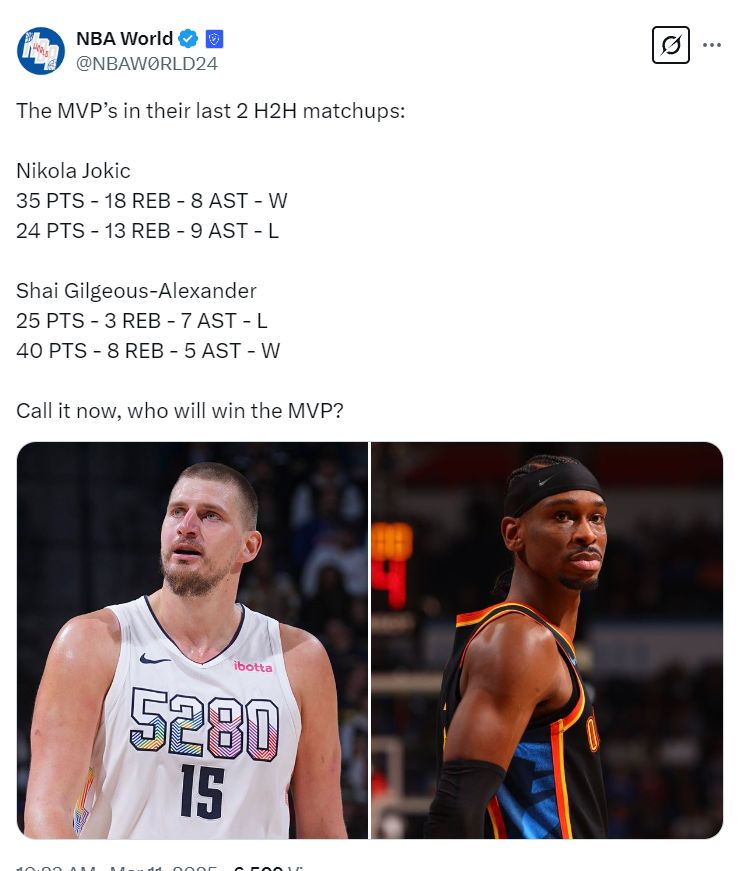 美媒晒出SGA与约基奇这背靠背两战的数据后写道:现在你们觉得谁是MVP。