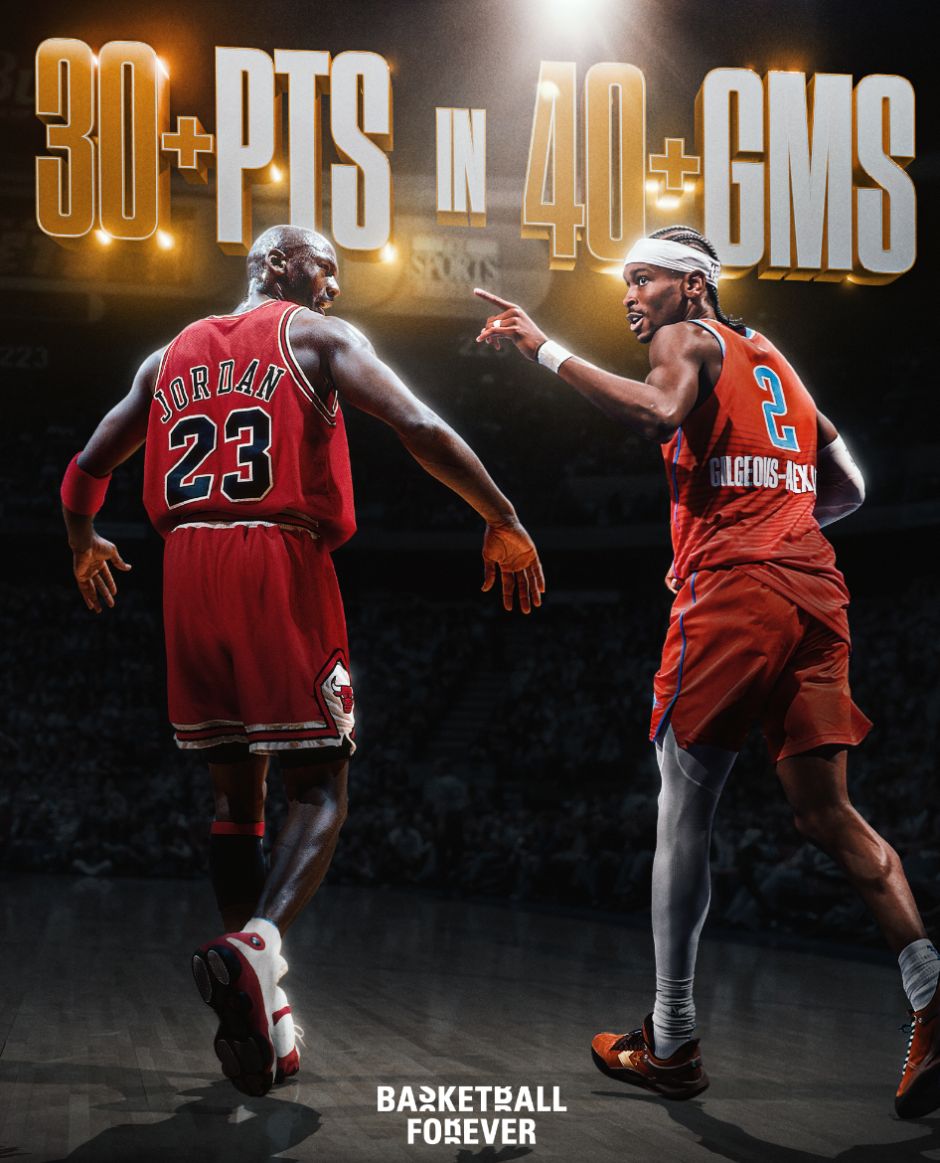 昨夜雷霆大胜掘金的比赛,亚历山大再度拿到40+,过去40个赛季只有乔丹与SGA两人连续三个赛季都至少有40次以上的30+,外界也将SGA击败约基奇的这场背靠背G1誉为“赢得MVP”之战,但这两人还有二番战。