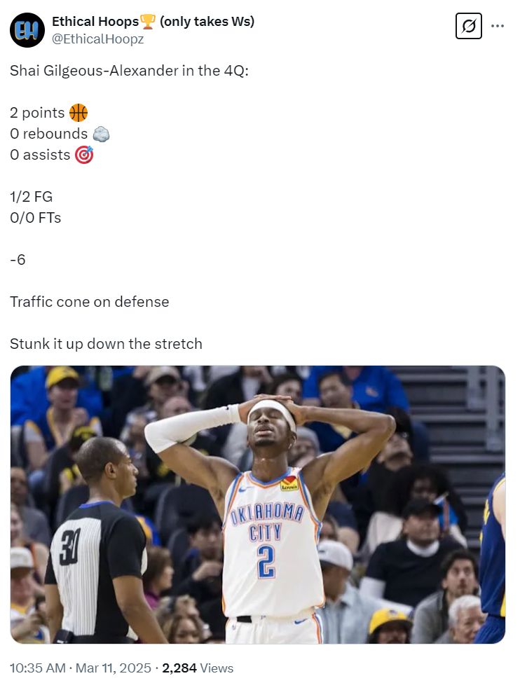 此役迈克-马龙让威少先发去盯SGA,但亚历山大顶着威少完成2+1,首节亚历山大打满12分钟,5中3+三分2中0拿到9分1篮板2助攻1抢断1盖帽,威少的防守不能说不成功,毕竟没有让SGA开场就找到外线手感。