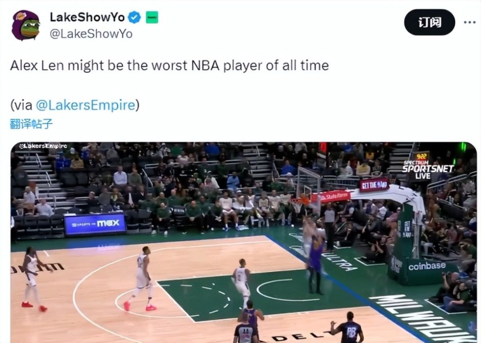 这一幕又被无数人吐槽。湖人自媒体LakeShowYo发布了这段视频,并且写道:“亚历克斯·莱恩也许是历史上最差的NBA球员。”