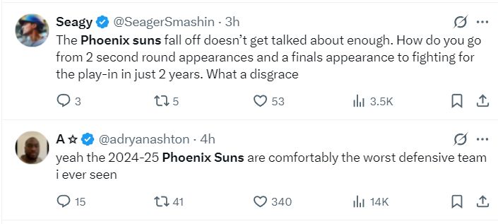 NBA记者埃文-斯迪瑞写道:这是太阳灾难性的一年,只有七支球队的战绩比太阳队还差:奇才、黄蜂、爵士、鹈鹕、篮网、76人和猛龙。