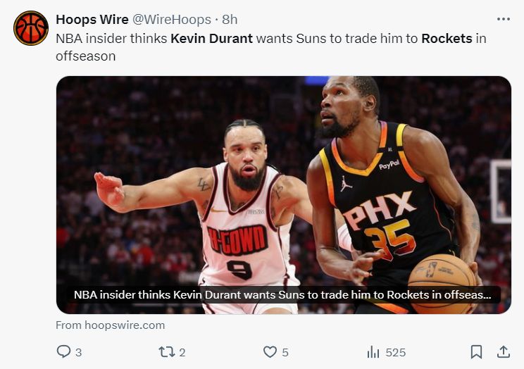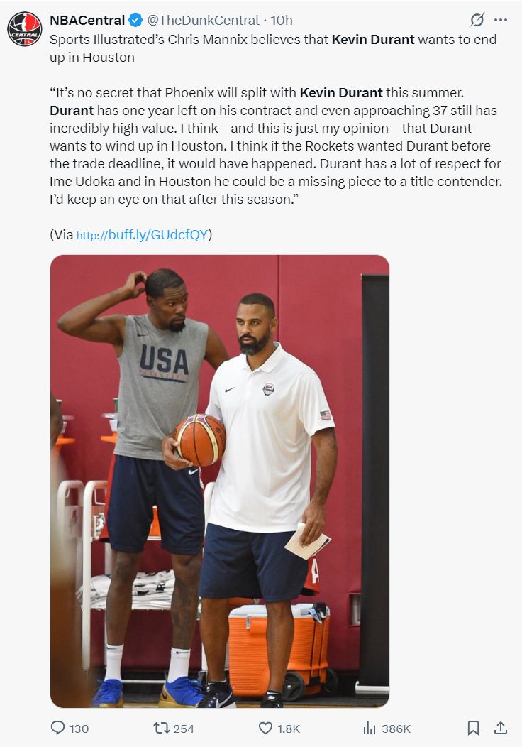 赛前,NBA记者克里斯-曼尼克斯曝出惊天猛料——杜兰特希望在今夏加盟火箭队,所有人都知道今夏太阳与KD会分道扬镳,杜兰特合同只剩一年,虽然他已经37岁高龄可状态保持不错,杜兰特很喜欢乌度卡,他会成为乌度卡阵容中的夺冠拼图,而双方已经谈妥,这件事早已成为定局。