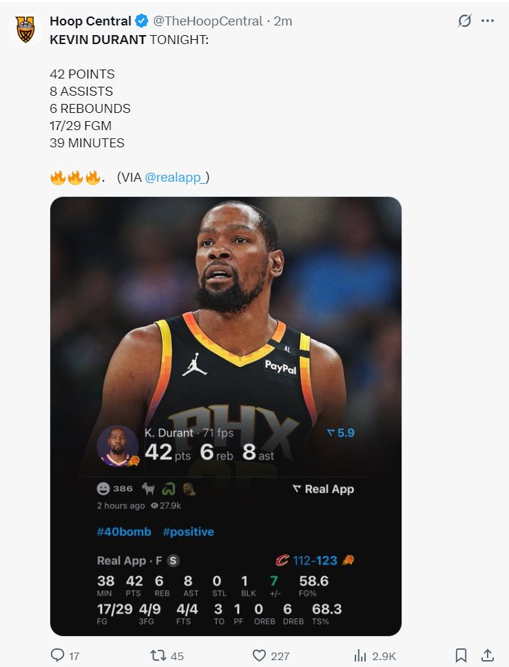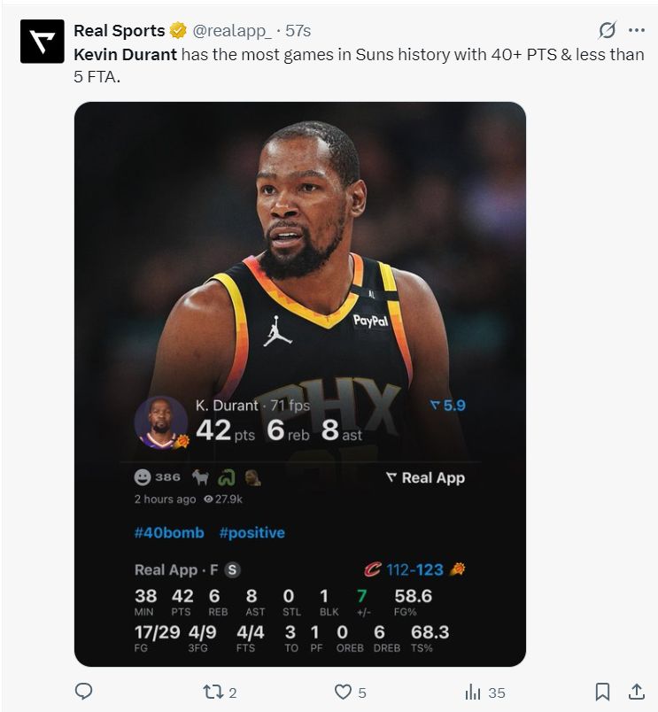 这场比赛后杜兰特已经完成对NBA30支球队都完成40+的壮举,他也是太阳队史单场最多40+罚球少于5个的球员。